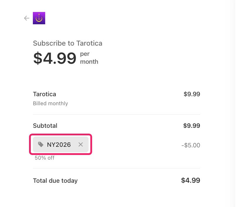 Start 2026 with clarity! To help you begin the new year with clear thinking and personal insight, Tarotica is offering a limited-time New Year discount on the website — 50% off all subscription plans!