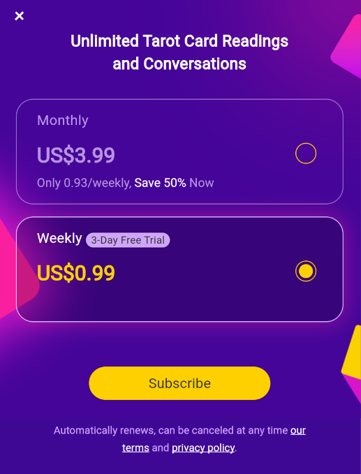 我们相信,神圣的指引不应价格昂贵。因此,我们彻底调整了定价策略,让每个人都能获得顶尖的洞见。没有门槛,没有高昂的费用——只有纯粹而深刻的直觉。